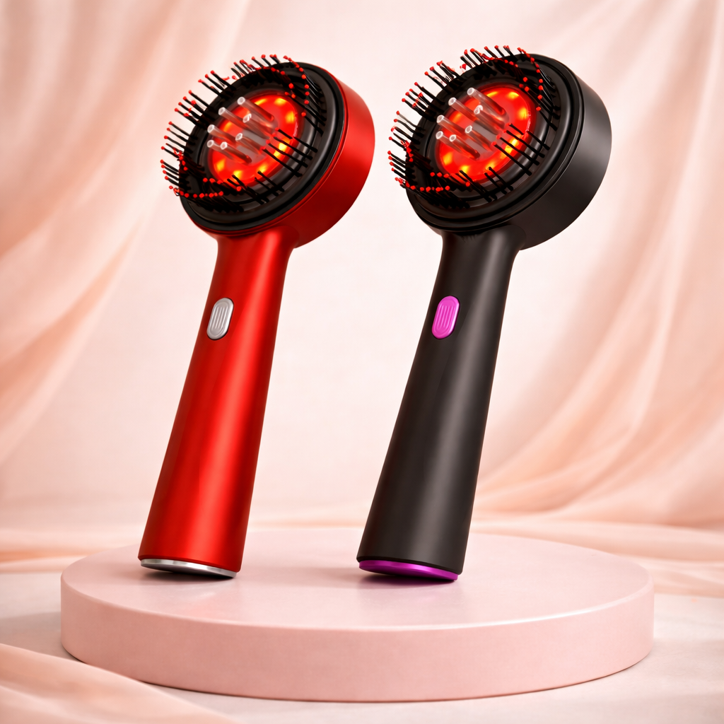 Brosse de massage électrique bi-vitesse avec lumière rouge stimulante et réservoir intégré pour diffuser vos huiles capillaires directement à la racine. Conçue pour revitaliser le cuir chevelu, booster la circulation et améliorer l’absorption des soins.