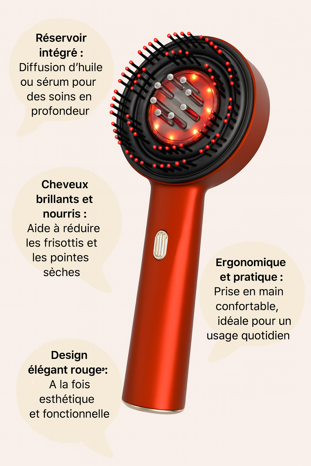 Réservoir intégré : diffusion d’huile ou sérum pour des soins en profondeur.